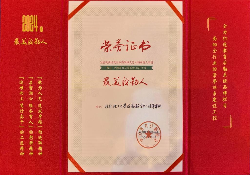 10月15日至16日,教育后勤现代化治理与高质量发展论坛暨全国教育后勤系统“2024年度最美后勤人”荣誉授予仪式在北京召开。我校后勤服务中心保障团队荣获全国教育后勤系统2024年度“最美后勤人”高校团队,成为本年度广西唯一获此殊荣的高校,标志着学校后勤工作获全国行业权威认可,也印证了广大师生对其服务的高度满意。
