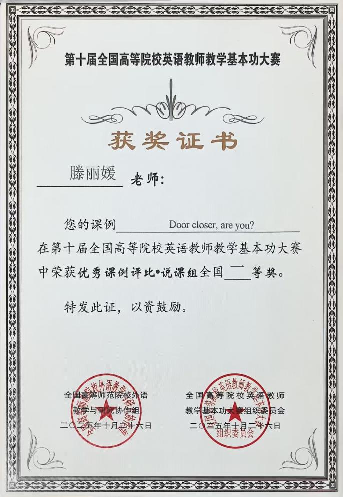10月26日,2025年全国高等院校英语教学学术年会暨第十届全国高等院校英语教师教学基本功大赛在江苏南京圆满落幕,来自全国高校近900名教师参加了此次大赛。我校外国语学院教师滕丽媛在本次比赛中表现突出,凭借扎实的教学功底、创新的设计理念与出色的现场表达,荣获说课组全国一等奖。
