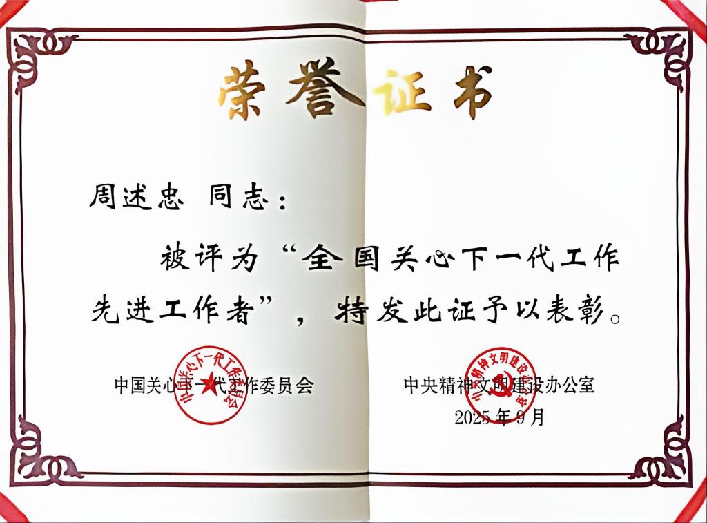 我校退休教师周述忠荣获2025年“全国关心下一代工作先进工作者”称号