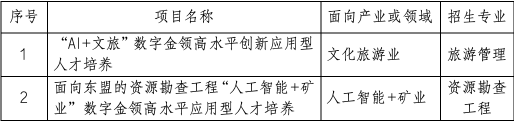 近日,自治区教育厅公布了人工智能数字金领高水平应用型人才培养项目名单,我校“AI+文旅”数字金领高水平创新应用型人才培养项目、面向东盟的资源勘查工程“人工智能+矿业”数字金领高水平应用型人才培养项目成功入选。