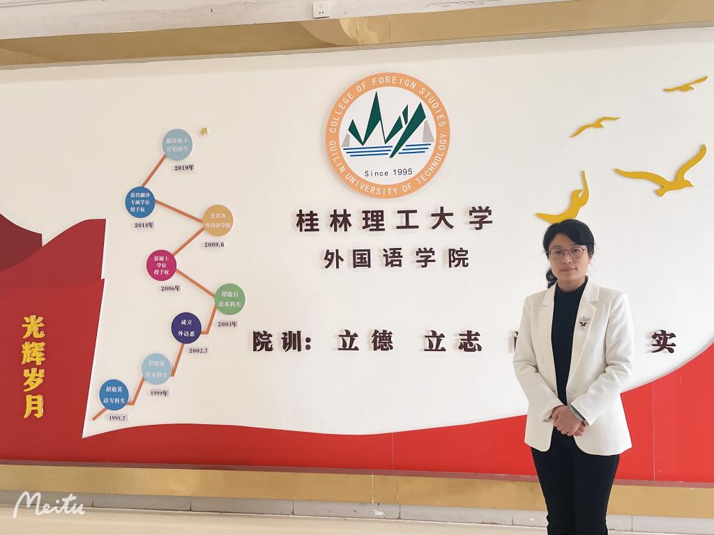 在科研方面,她立足广西实际,围绕“少数民族文化外译与国际传播”方向,带领团队探索学科交叉融合,开展了大量广西非遗文化外译实践研究,研究成果对讲好广西故事,提升广西文化软实力有一定的贡献价值。同时,自2021年以来,带领团队为桂林山水文化节的部分活动担任英文翻译,从自身学科优势出发,服务桂林世界级旅游城市建设。