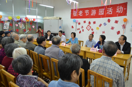 10月23日为我国传统的农历九月九日重阳节,学校离退处组织离退休老同志在老年活动中心欢聚一堂,开展敬老节游园活动。陈贵英副校长及校长助理、人事处处长华桂林,党(校)办副主任唐壮东、校党委组织部副部长白永生等到会祝贺。 陈贵英副校长代表学校向老同志们表达了节日的祝贺,感谢他们长期对学校的关心和支持。莫道桑榆晚,为霞尚满天,她希望全体老同志能继续为桂工的发展发挥余热,最后,她祝全校离退休人员节日愉快,身体健康,阖家幸福,万事如意。 离退休老同志们在游园活动上还表演了二胡合奏《荷塘月色》等文艺节目,剪纸协会还为老同志们送上了大大的“寿”字剪纸。之后老同志兴致勃勃地参加了摸奖、门球进球、投掷气排球等游戏,庆祝自己的节日。 活动开幕式由离退处副处长罗彩云主持,刚刚退休不久的原离退处处长陆娟娟也在开幕式上表达了感激之言。