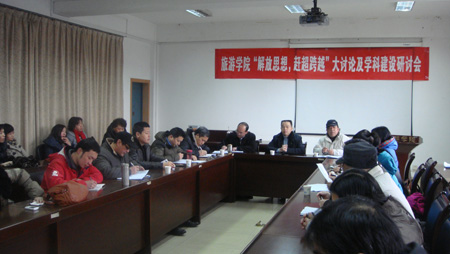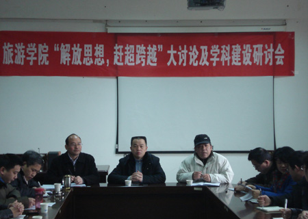 为贯彻落实学校“解放思想、赶超跨越”大讨论动员会精神,积极推进旅游学院教学与科研再上新台阶,3月3日上午旅游学院在屏风校区8501教室召开全院教职工“解放思想、赶超跨越”大讨论及学科建设研讨会。学校肖岳峰副校长出席会议并做了重要讲话,会议由该院党委李少游书记主持。 会上,该院各教研室主任围绕“解放思想、赶超跨越”议题,结合本教研室在教学科研工作中存在的问题和今后工作打算谈了各自的想法。接着,该院王金叶院长就强化教学、提升科研、创新观念、注重文化建设等方面谈了今后该院的工作思路。 最后肖岳峰副校长做了重要讲话,他指出,要高度重视“解放思想、赶超跨越”的意义,从学科建设的特点出发,充分利用学校和社会资源,提高教学与科研水平,实现旅游学院学科建设快速发展。同时要积极开展宣传和开展对外学术交流,不断扩大旅游学院知名度,努力创造良好的社会效应和经济效应。 与会其他人员结合自身岗位的实际,对学科建设和学院发展也发表了自己的观点,提出了一些很有见地的想法和思路。