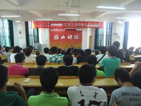 10月14日下午,我校与北方工业大学在雁山校区隆重举行本科校际交流生合作签约仪式。学校副校长吴志强教授,北方工业大学副校长罗学科教授分别代表本校签署协议。学校党(校)办、教务处、学工处等部门和机械与控制工程学院有关负责人以及北方工业大学教务处有关负责人出席了签约仪式。 吴志强副校长在签约仪式上发表了讲话。他代表学校党委、行政对罗学科副校长一行的到来表示热烈欢迎!他说,开展本科校际交流生合作是充分发挥两校优质教学资源、为广大学生提供第二校园学习机遇的重要举措,我校高度重视此次与北方工业大学的校际本科生交流合作,将采取有力措施,努力推进两校合作的顺利进行,尽快使本科生校际交流进入实质性阶段,并热烈欢迎北方工业大学的学生们到我校进行交流学习。罗学科副校长代表北方工业大学欢迎我校学生到北方工业大学交流学习,表示北方工业大学将为到校进行交流学习的同学们提供热情周到的服务,为同学们校际交流学习与生活的顺利进行提供有力保障。 随后,吴志强副校长、罗学科副校长各自代表本校签署了本科校际交流生合作协议。 签约仪式结束后,罗学科副校长为我校学生作了题为《机电一体化设备开发实例》的学术报告。报告中,罗副校长介绍了北方工业大学的总体情况,并以他自己结合经济社会发展需要而开发的机电一体化产品的四个实例——中空玻璃结构设备研制、地下水位实时远程监测及多数据传感技术、远程控制自动分水订量系列闸门研制、数控牙齿雕刻机,为在座师生们介绍了机电一体化技术广阔的应用空间和美好的发展前景。他希望同学们要热爱专业、热爱钻研、珍惜时间、珍惜友谊、学会合作,争取在将来取得更大的事业成就。讲座结束后,罗学科副校长还与同学们进行了互动,回答了同学们关心的专业问题和本科校际交流生合作的具体问题。罗副校长的讲座轻松幽默、通俗易懂、妙趣横生,使同学们在轻松快乐的氛围中拓展了专业知识,坚定了学好专业的信心。