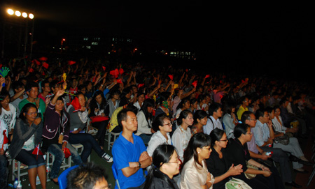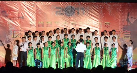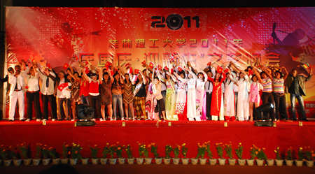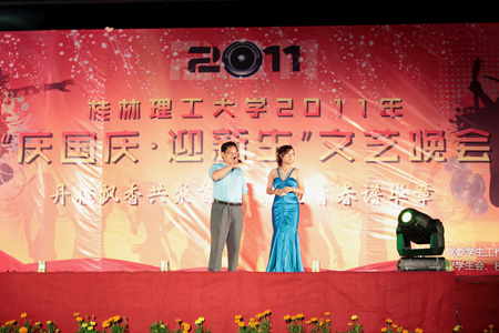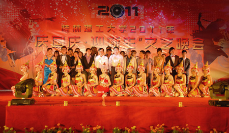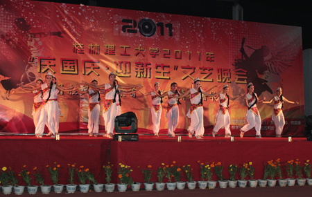 齐欢聚,共起航。恰逢国庆来临之际,为迎接2011级新生到来,一场以“丹桂飘香共聚首,激扬青春谱华章”为主题的2011年迎新生文艺晚会在学校雁山校区大操场隆重举行。学校校长张学洪,党委副书记王赣华,副校长陈学军、吴志强出席并观看晚会,党(校)办,党委宣传部、统战部,学工处(部),校团委,武装部及各学院相关负责人与全体新生一同观看了演出。 王赣华副书记为晚会致辞。他首先代表学校党委、行政向2011级新同学的到来表示热烈的欢迎,希望同学们在这喜气洋洋的夜晚感受到桂工大家庭的温暖,把桂工当成自已谱写青春新华章的起点,勤奋学习,早日报效祖国。 整场晚会形式多样,精彩纷呈。一曲《国家》拉开晚会的帷幕,艺术团合唱队的同学们经过了广西大学生艺术展演的洗礼,表现得越发成熟和自信,他们雄壮浑厚的歌声抒发了满腔的爱国情怀,为庆祝祖国62周年华诞送上桂工学子的祝福;紧接着舞蹈《踩云彩》用灵动优雅的舞姿展现出彩云之南的彝族人民的幸福生活,带动了新生们对美好未来的憧憬;古筝独奏《战台风》如高山流水结合书画协会同学挥笔方遒,引发现场欢呼不断;街舞《keep on dancing》热情洋溢,动感十足,展现了大学生追求时尚的风采;外文歌曲串烧《我和你》,来自不同国籍的留学生们用不同的语言表达对新生的欢迎与友好之情;我校青年教师蔡茂军老师的独唱《黄种人》、《精忠报国》赢得了全场喝彩;接下来是古朴典雅的服装走秀《霓裳》,美女俊男的组合顿时让整个舞台增色不少;管理学院艺术团的街舞《thriller & too bad》挥舞着青春的魅力,彰显青春的活力,欢快的舞姿使全场的气氛再次活跃起来。最后,晚会在艺术团舞蹈队的《瑶山书梦》的曼妙舞姿中落下帷幕。 晚会期间,张学洪校长还参加了抽奖互动游戏,为同学们送去了美好的祝福。 本场晚会为2011级新生带来了一场视觉与听觉的盛宴,唱响了青春奋进的主旋律,舞出了青春活力的动感节拍,同时也开启了他们大学生活的新篇章。