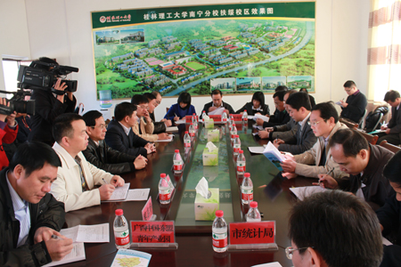 12月12日,崇左市委常委、常务副市长白松涛在扶绥县委书记蓝大煌、县长罗彪等县领导以及崇左市和扶绥县政府办、发改委、国土局、财政局等相关局委办领导的陪同下,到南宁空港校区调研,并在南宁空港校区建设指挥部召开重大项目推进工作协调会。学校党委赵艳林书记、肖岳峰副校长以及校长助理、高职学院院长刘宝臣等在南宁空港校区建设指挥部热情接待了来宾。 会上,扶绥县委蓝大煌书记就南宁空港经济区引进的重大项目推进情况进行了介绍。赵艳林书记、肖岳峰副校长向调研组介绍了南宁空港校区一期工程建设情况,重点就校区用地问题及以此相关的人才引进和招生规模扩大的情况进行了介绍。 白松涛常务副市长指出,桂林理工大学在较短的时间内完成了15万平米的建设任务,建成了一所功能完善、环境优美的大学校园,并已在9月中旬招入了2400多名学生,无论建设速度还是建设规模,都是南宁空港经济区重大项目龙头中的龙头,市国土局和扶绥县委县政府等一定要协调配合桂林理工大学解决遇到的困难和问题,确保不影响南宁空港校区下一步的建设和发展。