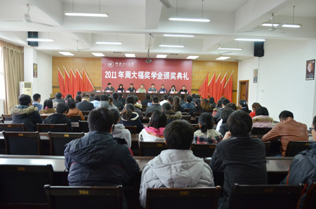12月8日下午,我校2011年周大福奖学金颁奖典礼在学校党校教室举行。学校党委王赣华副书记参加颁奖典礼,学校校友办、学工处、招生就业处及地球科学学院、管理学院、人文社会科学学院相关负责人及辅导员参加颁奖仪式。周大福珠宝金行华南区域营运管理中心也专门派员参加颁奖典礼。 本年度学校共有30名优秀学子获得周大福奖学金,每生奖励5000元,奖金总额15万元。王赣华副书记在颁奖典礼上简要介绍了我校学生资助体系,并对周大福公司长期以来给予我校教育事业的大力支持表示感谢,同时希望双方今后在学生实习实训基地建设、人才培养等方面加强合作。王副书记也勉励获奖学生珍惜大学美好时光,阳光心态面对各种困难与挑战,努力成才,回报国家、学校培养,回报社会爱心人士的关心。 据悉,学校不断构建多元立体化学生资助体系,近年来广泛发掘资源,重视社会资助,在校已经设立周大福奖学金、80校友奖学金、桔灯奖学金等。