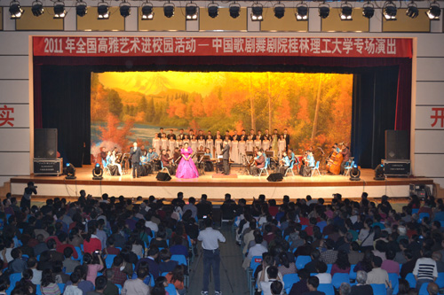 由教育部﹑文化部、财政部主办,广西壮族自治区教育厅承办的2011年高雅艺术进校园——中国歌剧舞剧院走进桂林理工大学专场演出于10月31日晚7点在我校屏风校区体育馆举行。中国歌剧舞剧院院长林文增、党委书记董天恒、副院长李小祥,我校党委副书记、纪委书记赵君,党委副书记王赣华,副校长陈学军、吴志强以及全校两千余名师生共同观看了演出。 学校党委王赣华副书记在演出开始前致辞,他代表全校师生感谢艺术家们不辞辛劳来到我校带来经典演出。他说,高雅艺术进校园活动,已经成为大学生了解艺术经典、接受艺术熏陶、提高艺术修养和艺术品位的有效途径,中国歌剧舞剧院的演出不仅让我们全校师生能够在校园里欣赏到高水平艺术团体的精彩演出,也为我校师生搭建了一个接触艺术、亲近艺术,提升艺术素养、感受艺术魅力的平台。随后,王副书记代表学校向中国歌剧舞剧院赠送礼物。 在国家一级指挥张峥先生热情奔放、充满活力的指挥下,欢快激扬的合唱《好日子》拉开了晚会的序幕,许多深受观众喜爱的中青年歌手纷纷登台献艺,激情四溢的演出令观众赏心悦目。整场演出荟萃了中外著名经典歌剧及经典歌曲,节目形式多样,内容丰富,异彩纷呈。既有《万泉河水清又清》等合唱,又有歌剧《珊瑚颂》、《图兰朵》等选段。还有民乐演奏《走马灯》、古筝独奏《渔舟唱晚》等让大家感受到中国民乐的独特魅力;新颖独特、极富青春气息的黑骑士组合带来的五重唱《游击队之歌》、《弹起我心爱的土琵琶》,《超级玛丽》、男声对唱《向天再借五百年》,海豚音独唱《歌剧2》、《忐忑》赢得了雷鸣般的掌声;青年男高音歌唱家李振涛演唱的《今夜无人入睡》将演出推向高潮。演出过程中,优秀主持人李小祥还与师生们进行了现场互动,使大家了解了很多音乐知识。演出在合唱《二十年后再相会》中画下了完美句号。精彩的表演让现场掌声不断,高潮迭起,气氛异常活跃。 中国歌剧舞剧院始建于1952年,是隶属国家文化部的国家级剧院。拥有歌剧团、舞剧团、民族乐团、管弦乐团、创作室及一个完整的舞台美术制作部。建院半个多世纪以来,剧院先后排练和演出了近百部著名歌剧和舞剧,如:歌剧《白毛女》、《窦娥冤》、《原野》,舞剧《红楼梦》、《铜雀伎》、《篱笆墙的影子》等。近年来,推出了《花木兰》等一批优秀音乐剧,出色完成了大型音乐舞蹈史诗《东方红》、亚运会、国际艺术节、国际合唱节以及接待外国元首(如美国前总统克林顿)访华等创作演出任务。 2011年“高雅艺术进校园”桂林理工大学专场演出活动提升了我校师生的艺术素养,陶冶了师生情操,让我校广大师生享受了一场艺术盛宴,在党的十七届六中全会提出促进社会主义文化事业大发展大繁荣的背景下,对促进我校校园文化建设具有积极意义。