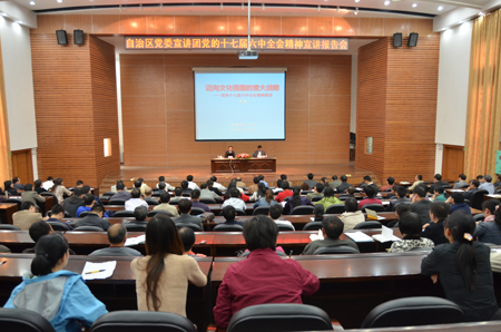 为深入学习贯彻党的十七届六中全会精神,11月24日下午,学校党委邀请自治区宣讲团成员、自治区新闻出版局党组副书记、副局长黄健在屏风校区图书馆报告厅为我校作了一场题为“迈向文化强国的重大战略”党的十七届六中全会精神解读的宣讲报告。学校党委副书记、纪委书记赵君主持报告会,学校副处以上领导干部,机关职能部门副科以上干部,马克思主义学院教师参加了会议。 黄健副局长的报告从解读十七届六中全会《中共中央关于深化文化体制改革、推动社会主义文化大发展大繁荣若干重大问题的决定》出台的深刻背景和重大意义开始,分别围绕: 1、关于改革开放特别是党的十六大以来文化建设取得的显著成就;2、关于推进文化改革发展的重要性和紧迫性;3、关于坚持中国特色社会主义文化发展道路,努力建设社会主义文化强国;4、关于深化文化体制改革,推进社会主义文化大发展大繁荣的主要任务和重大举措,这四个主题对党的十七届六中全会精神进行了解读。 报告以从理论到实践、从国际到国内的典型事例出发,同时结合大学校园文化建设发展,对党的十七届六中全会精神进行了深入的剖析和细致的解读,内容详实、观点鲜明,具有很强的指导性、针对性和操作性,使与会人员进一步加深了对党的十七届六中全会精神的理解,同时对建设社会主义文化强国的指导思想、重大意义、战略目标、形势任务和政策措施的领会更加到位,工作思路更清晰,目标也更明确。 学校赵君副书记在报告结束时做了讲话,他指出,黄健副局长对党的十七届六中全会精神的深入细致的解读,不仅帮助我们更加充分认识到十七届六中全会的重大意义,而且帮助我们更加准确地把握十七届六中全会《决定》的主要精神,具有很强的针对性和指导性。学校各部门、单位要按照学校党委的统一部署,不断加强学习,充分领会好十七届六中全会的精神实质,大力加强大学校园文化建设,以实际行动推动我校各项事业又好又快发展,以优异成绩迎接党的十八大召开。