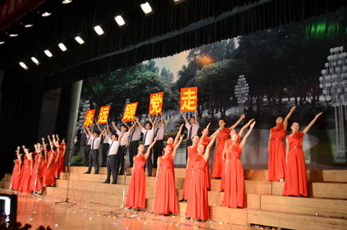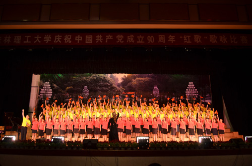 为庆祝中国共产党成立90周年,积极营造“唱红歌、颂党情”的良好氛围,由学校党委主办,党委宣传部、校工会承办的教职工红歌合唱比赛于6月29日晚在屏风校区体育馆三楼隆重举行,由学校各分会组成的二十一个合唱队参加了比赛,他们用饱满的热情、嘹亮的歌声,为党90岁生日献上了最美好的祝福。 校党委书记赵艳林,校长张学洪,党委副书记、纪委书记赵君,党委副书记王赣华,副校长陈学军,党委委员、校长助理、人事处处长华桂林,党委委员、组织部部长陈贵英等参加并观看了比赛。 晚上7时零1分,在全体与会人员的倒计时声中,比赛正式召开。 赵君副书记代表学校学校党委、行政对此次活动表示热烈祝贺!向一直以来关心、支持和参与学校建设发展的全校师生员工和离退休老同志表示衷心感谢!向全校共产党员道一声节日快乐!他在致词中说:中国共产党成立90年来的历史反复证明,没有共产党,就没有新中国的独立和富强;没有共产党,就没有人民的自由和幸福;没有共产党,就没有中国的社会主义现代化!历史无可雄辩地证明着:中国共产党是伟大的、光荣的、正确的党!在中国共产党领导全国人民建设发展的历程中,学校坚持党的正确领导,坚持社会主义办学方向,抢抓机遇,攻坚克难,实现了科学发展、和谐发展、跨越发展,学校各方面工作取得了喜人的成绩。 随后,各分会合唱队以一首首耳熟能详的经典红歌,歌唱心中的红色记忆,抒发对党和祖国的深情祝福,唱出了全体桂工人在学校党委的坚强领导下建设特色鲜明的高水平理工大学的决心与信心。比赛现场气氛热烈,台上教职工精神饱满、气势激昂,台下掌声如潮,其乐融融,呈现出欢乐祥和的气氛,此起彼伏的掌声欢呼声将歌咏比赛一次次推向高潮。 经过评委们客观、公正的评判,机关二分会、联合分会、体育教学部分会组成的合唱队和艺术学院分会合唱队荣获本次歌咏比赛的一等奖;机关一分会、外国语学院、土木与建筑工程学院分会合唱队获二等奖;材料科学与工程学院、化学与生物工程学院分会组成的合唱队,人文社会科学学院、马克思主义学院分会组成的合唱队,附属小学,博文管理学院,离退处等分会合唱队获三等奖,校领导给各获奖代表一一颁奖并合影留念。 本次比赛,大家以唱红歌为契机,把对党的无比热爱,对祖国的无限忠诚和对事业的不懈追求,融入美妙的歌声中。用歌声抒发他们的爱国之情、爱党之情和爱校之情,用红歌主旋律,营造桂林理工大学健康、向上、团结、奋进的良好氛围,激发全体桂工人的昂仰斗志,为建设特色鲜明的高水平理工大学而不断奋斗!