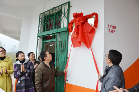辛立章书记和李先赠主任共同为“桂林理工大学团委关爱农民工子女志愿服务基地”揭牌,并向临桂县中庸乡中心小学捐赠了一批由我校学生募集的学习、文体和生活用品。