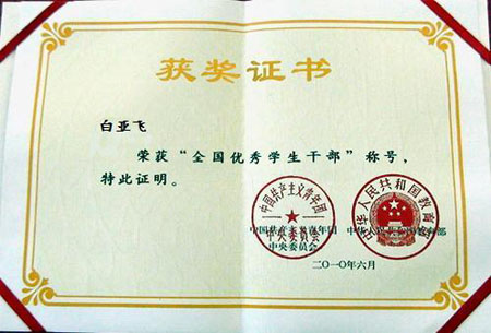 我校白亚飞同学获得“全国优秀学生干部”荣誉称号