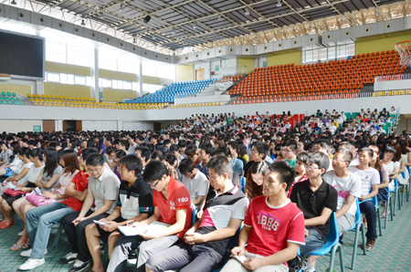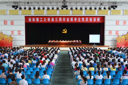 为认真贯彻落实大学生党的知识全程化、全方位教育实施方案,进一步加强我校毕业班学生党员的教育管理,在建党90周年前夕的6月9日上午,我校1000余名2011届毕业生党员在体育馆三楼参加了离校前的最后一次党员培训。 学校党委副书记王赣华出席开班典礼并作了题为《转变角色,勇于担当,在新的征途上做一名优秀共产党员》的首场专题报告。党校校务委员、党委办公室主任、校长办公室主任莫坷,党校校务委员、副教务长、党委学工部部长、学工处处长熊英,党校校务委员、学校团委书记辛立章,党校校务委员、党委组织部副部长白永生以及各二级党校校长、副校长等参加了开班典礼。开班典礼由学校党委组织部部长、党委党校副校长兼教务长陈贵英主持。 王副书记在报告中强调,大家还有不到半个月的时间即将顺利完成大学阶段的学习,将奔赴新的工作岗位或进一步的深造,在面向人生新的里程之前,希望全体党员同学尽快转变角色,做好“四个担当”:对党、对国家、对社会的责任要有所担当;对工作单位的责任要有所担当;对亲人家庭的责任要有所担当;要传承和发扬桂工精神,对母校发展和维护母校形象有所担当。王副书记还提到,党员同学在做好自己人生角色换转的同时,坚持党性修养不能变,要加强自主学习,永葆党员先进性,在新的征途上做一名优秀共产党员。 之后,白永生副部长作了《如何办理转移党组织关系手续》的专题报告,对毕业学生党员的组织关系办理流程及注意事项进行了详细介绍。 本次培训还将开展“感恩母校,祝福母校”主题实践活动,学员将结合自己学习成长经历和学校建设发展情况,撰写“我为母校发展建言献策”材料。各二级学院也会根据本学院实际情况开展“重温一遍入党誓词、重温一遍党章、上一堂特殊的党课、过一次特殊的组织生活、交一次特殊党费”的“五个一”教育活动,以增强毕业班党员的党性修养和感恩意识。