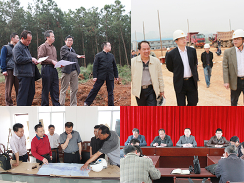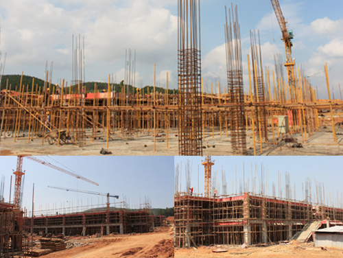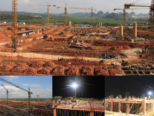 学校南宁分校扶绥校区一期工程建设项目自今年3月正式开工建设以来,得到了上级领导的高度重视和亲切关怀,自治区党委书记、自治区人大常委会主任郭声琨,自治区党委常委、统战部部长黄道伟,自治区人民政府副主席杨道喜,自治区国资委党委书记尹建国,崇左市委书记赵乐秦,自治区教育厅副厅长杨伟嘉等领导先后亲临施工现场视察指导。郭声琨书记在施工现场视察并听取汇报后,充分肯定了我校选址扶绥建设新校区的意义,对新校区的建设作出了重要指示,上级领导的悉心关怀为扶绥校区的建设注入了新的动力。工程建设期间,学校党委书记赵艳林、校长张学洪等校领导多次到施工现场检查、指导和督促各建设项目的进展情况,校领导的关心和指导为扶绥校区的建设提供了有力的保证。扶绥县委县政府更是大力支持和配合新校区的建设工作,崇左市委常委、扶绥县委书记白松涛、县长吴强等领导多次前往施工现场调研,就建设中存在需要协调解决的问题专门召开现场办公会,要求相关部门限期解决,为扶绥校区的建设提供了大力支持。 在各级领导的悉心指导和当地政府的大力支持下,扶绥校区建设指挥部全体成员团结协作、真抓实干,组织各承建单位昼夜施工、狠抓工期,全力以赴确保一期工程建设项目优质高效完工。截止目前,扶绥校区一期工程各建设项目已完成基础施工,多数建筑已完成一层墙体的砌筑和一层顶板混凝土的浇筑,部分教学楼已完成二层顶板混凝土的浇筑。