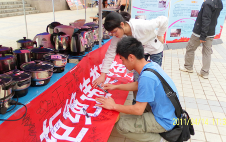 学生在“创建文明宿舍,拒绝违禁电器”横幅上签名