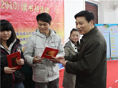 王赣华副书记在闭幕式上发表讲话。他充分肯定了读书月活动开展以来取得的成绩,并指出,通过活动的开展,强化了同学们阅读的理念,养成了读书的习惯,凝聚了浓郁的书香,洒下了辛勤的汗水,拂去了一份浮躁,沉淀了一份底蕴,享受了阅读的快乐,收获了丰硕的成果,构筑起桂工学子成人成长成才道路上的一座桥梁,勾画出桂工学子精神风貌的一道靓丽风景线,打造成了我校校园文化建设的一项品牌活动。同时,他对继续开展好这项活动提出两点希望:一是希望加强活动的组织领导。各级领导和各主办部门对活动要高度重视,把读书月活动作为我校校园文化建设的一个品牌和精品活动来抓,要加大必要的人力和物力投入,加强工作的协调配合,把活动列入年度重点工作计划精心安排,形成合力和长效机制。二是希望加强活动的策划创意。各主办和承办部门单位以及全校广大师生群策群力,根据青年学生成人、成长、成才的规律、特点和需求,进一步做好活动的策划和创意,锐意进取,加大创新力度,丰富活动内涵,拓展活动形式,增强活动效果,继续打造好“读书月”活动这个品牌。