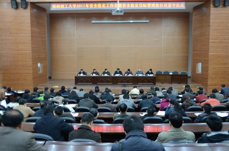 随后,举行了安全稳定目标管理责任状签字仪式。由王赣华副书记,肖岳峰副校长代表学校党委、行政与二级学院、职能部门、直属单位党政负责人签订《桂林理工大学2011年社会治安综合治理和安全稳定工作目标管理责任书》、《桂林理工大学2011年消防安全目标管理责任书》。 张学洪校长在会上对我校2011年安全稳定工作做了重要讲话,强调各单位、部门一定要把安全稳定工作放在首要地位,提高安全责任意识,确保校园安全;切实做好安全稳定防范、安全隐患排查工作,发现问题及时解决;完善责任追究制度,要把安全稳定工作落实到位。同时要求各单位、部门要召开专门会议,统一传达并贯彻落实本次安全稳定工作会议的精神,确保我校校园安全稳定。