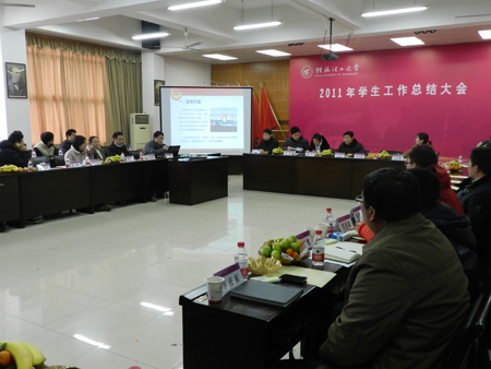 为了创新学生工作理念,凝聚学生工作各方面力量,扎实推进我校学生工作再上新台阶,1月9日下午,我校在屏风校区党校隆重召开2011年学生工作总结大会。学校党委副书记王赣华出席总结会,除值守雁山学工人员外,学工部(处)、校团委全体干部和各学院党委副书记、学工组长和全体辅导员参加了会议。 会上,学工部(处)熊英部(处)长和校团委辛立章书记先后就主题教育、学生管理、队伍建设、学生资助、校园文化活动、课外竞赛、科技活动等方面取得的成绩和今后的工作举措做了总结。各学院结合自身工作的特色和亮点做了介绍,其中地球科学学院的的“四重”工作原则,环境科学与工程学院的本科生班导师办法,材料科学与工程学院构建优良学习氛围,土木与建筑工程学院的特色“三下乡”工作,管理学院的资助育人体系,信息科学与工程学院的科技文化周活动,机械与控制工程学院的学生干部选拔培养体系,化学与生物工程学院的学生党建办公室,外国语学院的学生励志社团建设,旅游学院搭建的就业实习平台建设,艺术学院的结合专业特色的“安全稳定”活动月,理学院的“数学建模”活动,人文社会科学学院的“挑战杯”项目,应用技术学院的班级团建活动,都在此次大会上得到充分的展示和交流。 学校党委王赣华副书记在会上对过去一年的各项学生工作给予了充分的肯定,并希望学工、团委以及各辅导员老师们能再接再厉,充分认识未来大学生思想教育工作的形势,用辩证的思维看问题,克服当前我校多校区办学的困难,创新理念,凝聚力量,为学生工作的建设和发展多尽一份心,多出一份力,共同推进我校学生工作再上新台阶。