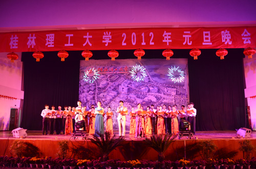 在元旦佳节到来之际,我校于12月30日、31日晚分别在屏风校区体育馆和雁山校区体育训练馆隆重举行2012年元旦晚会。学校党委书记赵艳林,校长张学洪,党委副书记、纪委书记赵君,党委副书记王赣华,副校长肖岳峰、陈学军、吴志强出席并观看了屏风校区的文艺晚会。王赣华副书记、陈学军副校长还出席了雁山校区的文艺晚会。全校数千名师生观看了晚会。 赵君副书记、王赣华副书记分别在屏风校区和雁山校区的晚会上致辞,代表学校党委、行政向广大师生员工送去节日的祝福。他们总结了我校2011年一年来所取得的骄人成绩,充分肯定了广大师生在过去一年里的辛勤努力,并对我校2012的各项工作寄予了美好的期望,希望全校师生在新的一年里团结奋进,拼搏进取,为建设特色鲜明高水平理工大学贡献力量! 晚会会场气氛热烈,节目精彩纷呈。欢快的舞蹈《神州欢腾贺新春》拉开晚会的帷幕;歌伴舞《我和我的祖国》道出了桂工师生的爱国情怀;灵动的音符,动人的旋律,乐器合奏《茉莉花》、诗歌朗诵《写给青春》与一支《西班牙之火》更是将青春的活力点燃;男女合唱《爱在天地间》的感人歌声温暖了在场观众的心房;我校外国留学生的合唱《Remember this night》让我们记住了这个欢快的夜晚,希望在新的一年里珍惜所拥有的每一天;《梨花颂》、《弹起我心爱的土琵琶》,我校教师以各自的方式为全校师生送去欢乐和祝福,整场晚会在欢乐祥和的氛围中落下帷幕。 晚会期间,校领导赵艳林、张学洪、赵君、王赣华、肖岳峰、陈学军、吴志强还上台参加抽奖游戏,为在场的师生送去新年祝福。 悦耳的歌声和曼妙的身姿演绎了炫舞飞扬的晚会,激情的掌声和愉快的欢呼点缀着流光溢彩的夜晚。在这样欢乐的夜晚,大家一起送走硕果累累的2011年,在全校师生的祝福下,迎来满怀希望的2012年,让我们带着对新年的美好憧憬,踏上新的征程,祝愿桂林理工大学明天更美好!