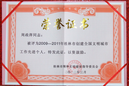 3月31日上午,桂林市召开创建全国文明城市工作总结暨表彰动员大会,我校社区办主任周政萍受到表彰,荣获2009-2011年桂林市创建全国文明城市工作先进个人荣誉称号。 2009年以来,在学校创建全国文明城市工作领导小组的领导下,周政萍同志以强烈的责任心积极主动开展工作,将创建全国文明城市与加强“校园清洁工程”管理工作紧密结合起来,认真组织开展文明社区的创先争优评比表彰活动,加强社区物防、技防、人防、消防等安全保障工作和社区综治工作,并取得了良好成效,为推进学校安全文明和谐校园建设和桂林市创建全国文明城市做出了积极贡献。