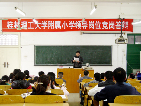 4月11日下午,学校举行附属小学领导岗位竞岗答辩会。学校副校长肖岳峰,校长助理、人事处处长华桂林,党委组织部部长陈贵英,校工会副主席陆平,桂林市教科所科研规划办主任席广涛,七星区教育局教研室书记贺琳等出席答辩会并担任专家评委。附属小学全体教职工任群众评委参加答辩会。
