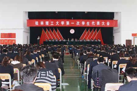 4月9日,学校第一次学生代表大会在雁山校区体育训练馆隆重召开。学校党委副书记王赣华、学工部(处)和校团委负责同志、各学院党委副书记(直属党支部书记)、团委书记和区内部分高校学生会代表出席大会。学校383名学生代表参加了大会。 上午10:30,大会正式会议在庄严的国歌声中拉开帷幕。学校团委书记辛立章为大会致开幕词,工作人员宣读了自治区学生联合会和广西大学学生委员会发来的贺信。张紫文同学代表桂林工学院第十六届学生委员会作了题为《求真务实 锐意创新 团结带领全校学生为建设特色鲜明高水平理工大学贡献青春和力量》的工作报告。报告全面回顾了过去五年来学生会的工作,总结了学生会在丰富实践中积累的宝贵经验,分析了存在的问题和不足,对未来一段时期学生会的工作提出了建议和展望。 王赣华副书记在会上作了重要讲话。他高度评价和充分肯定了过去五年来学生会的工作。他指出,实现建设特色鲜明高水平理工大学的奋斗目标,需要广大学生会干部和广大青年学生的共同参与。他要求,全校广大同学要自觉学习实践社会主义核心价值体系,树立正确的世界观、人生观、价值观和坚定的共产主义信念;新一届学生会要不断加强自身建设,围绕学校中心工作,服务青年学生成长成才;广大学生干部要刻苦学习、勤奋工作,努力做到让党放心,让青年学生满意。他强调,学校各级党组织要不断加强和改进对学生会的领导,支持学生会开展各项有益的工作和活动,关心学生干部的发展和成长;共青团组织要更好地发挥对学生会的指导作用,帮助、支持学生会以改革创新的精神进一步加强自身建设,不断提升对青年学生的吸引力、凝聚力和影响力。 大会审议通过了桂林工学院第十六届学生委员会工作报告,民主选举产生了桂林理工大学第一届学生委员会。在随后召开的学生会一届一次全委会上,民主选举产生了学生会常务委员会和主席团。