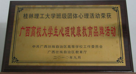 日前,在广西高校工委和自治区教育厅组织开展的“2010年广西高校大学生心理健康教育活动月系列活动”中,我校“班级团体心理活动”被评为“广西高校大学生心理健康教育品牌活动”,此次全区高校共有34项大学生心理健康教育品牌活动参加评选,经过区高校工委和教育厅组织的网评和专家评审,共评出10项“广西高校大学生心理健康教育品牌活动”。