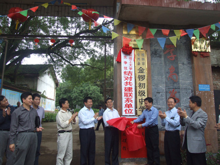为贯彻落实中央和自治区党委关于开展创先争优活动、学习型党组织建设活动、党组织建设年活动、“结对共建、先锋同行”活动的有关精神,推进我校创先争优活动的深入开展,我校经认真调研,决定与桂林市全州县绍水镇金锣初级中学开展结对共建活动。 9月28日,我校党委书记赵艳林,党委副书记、纪委书记、工会主席赵君,党委委员、党委组织部部长陈贵英,党(校)办主任莫坷,党委宣传部、统战部部长秦宏毅,工会副主席陆平一行到金锣初中举行了结对共建仪式,并为金锣初中送去了办公桌椅、投影仪等第一批援建物资。全州县委书记贺志刚及全州教育局、绍水镇等有关单位负责人出席仪式,全州县委常委、党委组织部部长吴应新主持仪式。 金锣初中校长张祖皓在仪式上介绍了金锣初中的基本情况,学校近年来取得的优秀成绩,以及学校发展中遇到的迫切需要解决的困难和问题。他代表金锣初中全校师生衷心感谢我校的大力支持和帮助,并表示全校师生为此深受感动和鼓舞,将更加勤奋工作、努力学习,为党的教育事业和社会发展做出新贡献。 贺志刚书记向赵艳林书记一行表示热烈的欢迎,向我校对全州教育事业和经济社会发展的关心和支持表示衷心的感谢。他希望全县各有关部门要抓住机遇,主动争取结对共建单位支持,进一步理清发展思路,加强组织协调,积极主动参与创先争优活动,切实增强党员的荣誉感和使命感,激励广大党员争当“五带头”党员,在各行各业当先锋做表率,积极创建“五个好”党支部,努力实现“党员受教育、群众得实惠、党建上台阶、发展见成效”的工作目标,推动全州科学发展再上新台阶。 赵艳林书记在仪式上指出,开展结对共建活动是我校贯彻落实中央和自治区党委关于开展创先争优活动、学习型党组织建设活动、党组织建设年活动和“结对共建、先锋同行”活动总体部署的实际行动,也是学校积极服务于地方经济社会和教育事业发展的一项重要举措。结对共建仪式标志着桂林理工大学与金锣初中结对共建活动的正式开始,今后我校将发挥优势,在办学条件、师资培训等方面对金锣初中给予支持,帮助金锣初中提高教学质量和办学水平。他希望通过这次结对共建,金锣初中党支部更加重视支部建设,更好地发挥党支部的战斗堡垒作用和党员的模范先锋作用,团结带领全校教职工为培养社会主义建设事业接班人做出更大贡献。 随后举行了捐赠仪式及揭牌仪式,赵艳林书记与贺志刚书记共同为桂林理工大学“创先争优、结对共建”联系单位揭牌。 当天,赵艳林书记一行在全州县委书记贺志刚,县委常委、组织部部长吴应新及县教育局、绍水镇、金锣初中等单位有关负责人的陪同下参观了金锣初中的学生食堂、教职员工宿舍,察看了学校教学设施等情况。