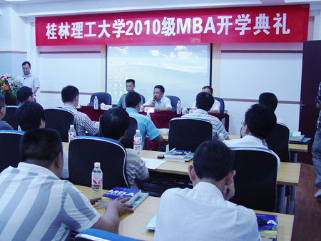 9月18日上午,我校首届MBA新生开学典礼在学校MBA大楼7309报告厅隆重举行。学校副校长吴志强,管理学院院长周永生,研究生处副处长金峰出席典礼,典礼由学校MBA教育中心副主任邹勇主持。 吴志强副校长首先代表学校向2010年首届MBA学员表示衷心的祝贺,并勉励学员在校期间勤奋学习,珍惜来之不易的学习机会,用青春与汗水、聪明与才智,取得优异的学习成绩,谱写人生最美好的乐章,为母校增光,为人生添彩!吴副校长还对学员提出几点希望:一是做学问要先做人,不断加强自身修养,树立正确的世界观、人生观和价值观,培养乐观向上的品格、勇于探索的信念和豁达包容的精神,尊敬师长,虚心求学,不断进步;二是珍惜来之不易的学习机会,在导师的指导下积极参与科学研究,培养创新意识、创新思维和创新能力,树立正气,端正学风,以自己的辛勤劳动,创造优异的成绩;三是保持高度的社会责任感,胸怀祖国,放眼世界,传承和发扬“勤奋、求实、献身、开拓”校训,自强不息,奋勇向前! 管理学院周永生院长代表学院对学员们表示热烈欢迎,并介绍了管理学院办学历史和发展概况,对学院的科研实力及MBA师资力量等方面进行了重点介绍。周院长鼓励学员,在我校进行MBA课程的学习期间,要做好角色的转换,通过认真刻苦的学习培养能力,提高修养。希望每个学员在桂林理工大学MBA学习期间在实战能力、综合性学问、战略性思维、创新型意识、全球性眼光等方面都得到全面提升。祝愿MBA学员在两年的学习中,学业有成,事业进步! 最后,2010级MBA新生王智军代表MBA学员进行了发言。表示将珍惜这来之不易的学习机会,勤奋学习,专心科研,续写桂林理工大新的辉煌!