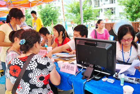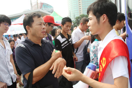 (二)迎新志愿者——骄阳下最美的花: 为迎接来自全国各地的2010级新生,围绕在他们周围的桂林理工大学的迎新志愿者也成为了一道亮丽的风景。9月11日一大早,志愿者们挂上迎新志愿的工作牌,精神抖擞开始迎新工作。 从踏入桂林的那一刻起,2010级新生便可以体会到桂林理工大和她的志愿者对自己的关心和照顾。新生报到期间,火车站、汽车站分别有桂林理工大学派出的校车和老师、志愿者在等候新生的到来。志愿者们主要负责引导出站新生们至休息候车区,并引导他们有序地上校车。 在发往两个校区的迎新车上,党员和迎新志愿者们用亲切的口吻向车上的新生以及陪同家长介绍学校的基本状况以及学校周边的环境,同时介绍桂林美丽的风景,并就安全问题和新生防诈骗问题提出忠告或建议。 来自旅游管理07—7班的丘丽笑着说,当年她踏入桂林理工大学的时候,热情学哥学姐们来她接待她,现在大四的她即将离校实习,也想象当初的学长学姐一样热情地迎接远道而来的新学弟和新学妹们。候车间隙,记者采访了一名志愿者,他告诉我们,他今天已经跑了五趟宿舍楼了。迎新工作着实累人,但他们的心情犹如一句常说的话“累并快乐着”,能帮就帮,心里感到非常满足。