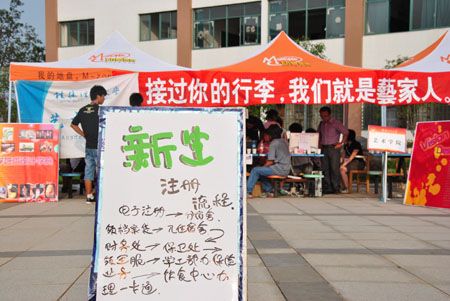 随着迎新时间的进一步推进,9月12日我校迎新工作进入第二天。由于学校相关部门及各二级学院迎新工作准备充分、安排周密,高效的工作和热情的服务受到了广大新生和家长的好评。 (一)两个校区彩装迎新: 为了迎接2010级新生顺利入学,两校区里外都穿上了新的着装,宏伟气派的雁山校区新大门正式通行,以全新的面貌迎接自己主人的到来。两个校区校道两旁彩旗迎风飘扬,为勃勃生机的校园又添了新的韵律。此外,在学校食堂、教学楼、各宿舍楼欢迎新同学的横幅异常醒目温馨。在雁山校区三栋广场和屏风校区小树林,都是一片忙碌而有序的景象:各学院在广场上均驻扎了具有本学院特色的大本营,所有工作人员以饱满的热情接待每一名前来报到的新生以及其家长。