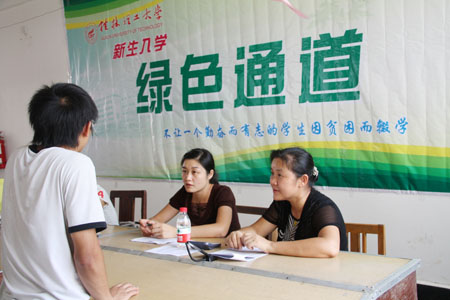 (三)“绿色通道”——通向绿色的心田: 11日上午,校长张学洪来到雁山校区新生“绿色通道”办理现场指导工作,为有效落实“绿色通道”政策,我校在向新生寄发录取通知书同时附寄我校资助政策宣传材料,确保每个新生都能够全面详细了解国家资助政策和我校具体的措施:入学新生们只要持有学校缓缴学费申请表、家庭经济情况调查表以及生源地贷款受理书便可以在楼绿色通道办理缓交学费手续。其中还特别设有汶川、玉树、舟曲等重灾区新生生源地贷款缓缴办理点。 趁着手续办理的间隙,记者采访了一些同学和家长。同学们纷纷表示非常喜欢桂林理工大学,很希望能来到这个学校读书,但来校的时候老担心学费不能凑齐会影响到入学手续办理,没想到学校有“绿色通道”这样的助学政策,让学费的问题可以暂时得到解决,也不会影响到学习。感触最深的还是家长,借用一位家长最实在的话:“政策好啊,这可解决我家的大问题了!”话虽朴实无华,却道出了众多家长的心声。