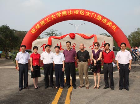 9月10日上午9点整,我校雁山校区新大门落成暨揭牌仪式在新大门前隆重举行。学校校长张学洪,党委副书记王赣华,副校长陈学军、吴志强,雁山区委常委、区委副书记石自强,雁山区委常委、区委统战部部长李红,雁山区人大副主任廖发有,雁山镇镇长谢静等雁山区领导出席揭牌仪式。仪式由陈学军副校长主持。学校部分教职工、学生代表参加了揭牌仪式。 张学洪校长在致辞中首先代表学校对支持学校建设、发展的各位领导、全体教职员工以及同学们表示衷心的感谢并向全体教师致以节日的问候。他说,学校雁山校区新大门的竣工落成标志着我校雁山新校区建设取得了阶段性的成果。目前,雁山校区建筑面积已达到26万平方米,能够同时容纳9000名学生学习、生活。现在,二期建设即将启动,希望各位领导、老师、同学能一如既往地支持学校的建设,关心学校的发展。 雁山区委副书记石自强在揭牌仪式上发表讲话。他代表雁山区委、区人大、区政府以及雁山区13.5万人民对我校新大门的落成、新校牌揭牌表示热烈祝贺。石自强副书记说,桂林理工大学新大门的落成,标志着桂林理工大学的建设进入了又一个崭新阶段;标志着雁山区在旅游通道上又多了一道风景线;标志着雁山区又多了一个醒目的新地标。多年来,桂林理工大学的发展与雁山区城区建设发展同呼吸、共命运,为雁山区的建设与发展作出了突出贡献。他相信,桂林理工大学和雁山区在未来的发展建设中一定会蒸蒸日上,日新月异,同创辉煌! 最后,张学洪校长与石自强副书记共同揭开红绸,也揭开了桂林理工大学发展新的篇章。