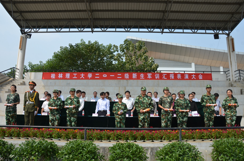 9月28日上午,在经过十多个昼夜的艰苦训练后,我校2012级新生军训的最后一次检阅——军训汇报表演在雁山校区体育场隆重举行。学校党委副书记王赣华、副校长陈学军、武警桂林市支队少校刘广门和党(校)办、宣传部、学工部、团委、武装部、教务处、后勤处及各学院主要负责人出席了汇演。汇演由学校武装部部长崔光仁主持。 早晨8点半,同学们早早地来到操场,在教官的带领下温习一遍,将技术要点烂熟于心,下一刻,他们将踏上“阅兵场”,为集体和自己争取荣誉。10时整,伴随着雄壮的《中国人民解放军军歌》,军旗缓缓进入演练场,全场起立,神情庄重。王赣华副书记在武警桂林支队刘广门少校的陪同下,依次检阅了军训各连队。同学们整齐的队列和嘹亮的口号声,展现了我校新生不畏艰苦、一往无前的气概。 各连队的分列式表演作为整个汇报表演的主体,展现的是同学们十多天来刻苦训练的成果。各连队有序入场,接受检阅,每位同学都打起十二分的精神,争取把各项动作做得更好。男生连首先入场,他们原地踏步,踢正步……这些动作都有板有眼,颇有钢铁之师的风范。女生连的同学们也都英姿飒爽,颇有巾帼不让须眉的气概。男生擒敌拳表演方队操练的气势恢宏,女生列队操表演的整齐划一,教官们近身格斗招招制敌……操场上回响着阵阵掌声。 汇报演出后,校办副主任程安福宣读《关于表彰2012级新生军训先进集体和先进个人》的决定,共有13个连队和420人获得表彰。紧接着,陈学军副校长在大会上致辞,他表达了对承训官兵的崇高敬意和对参训新生的热烈祝贺,并向新同学们提出了三点希望:一是希望同学们发扬军训期间的成果,保持良好品质;二是希望同学们明确目标,努力学习,在学校成长、成才;三是希望同学们在未来的工作中勇挑重任,不辱使命。陈副校长情真真切的话语,让同学们感受到目标明确、使命光荣。 2012级新生军训汇报表演在嘹亮雄壮的国歌中圆满落下帷幕。
