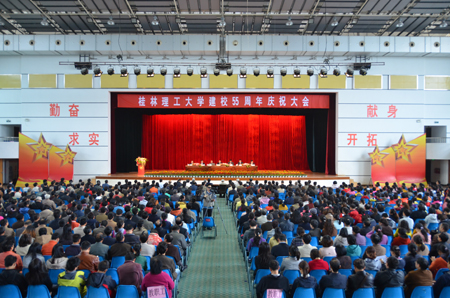 11月10日上午,在嘹亮的国歌声中,桂林理工大学建校55周年庆祝大会在屏风校区体育馆隆重召开。校党委书记赵艳林,校长张学洪,校党委副书记、纪委书记赵君,副校长陈学军、吴志强,校长助理、党委委员华桂林出席会议并在主席台就座,学校原党委书记、离休老干部、老红军柳林同志应邀出席大会。全校处级领导干部、教师和学生代表,离退休教师代表参加了庆祝大会,大会由张学洪校长主持。 赵艳林书记在庆祝大会上发表了重要讲话,他首先代表桂林理工大学党委、行政,向在学校55年发展征程中作出卓越贡献的历届学校领导、离退休老同志及全校师生员工致以崇高的敬意和节日的问候! 赵书记在讲话中,回顾了学校55年来十易校名,五改归属的艰辛发展历程及学校在人才培养、学科建设、师资队伍建设、科学研究等方面取得的伟大成就。强调55年来,学校秉承“勤奋、求实、献身、开拓”的校训,积淀、形成了优良的办学传统,并凝炼、升华为“艰苦创业、敬业奉献、团结协作、开拓创新”的“桂工精神”,正是这种弥足珍贵的精神财富,为学校的发展进步提供了强大动力和不竭源泉,激励着一代又一代桂工人立志高远、克服困难、积极进取、顽强拼搏,从而取得了今天的可喜成绩,学校由小到大,由弱变强,办学层次不断提升,办学条件大大改善,教学科研成果日渐丰硕,综合办学实力有了翻天覆地的变化。 讲话中,赵书记提出了学校未来发展规划,强调指出要以55周年华诞为新的开端,进一步增强使命感和责任感,继承和发扬学校办学的优良传统,深入贯彻落实科学发展观,全面贯彻落实全国、全区教育工作会议精神和国家和广西中长期教育改革和发展规划纲要,认真学习胡锦涛总书记在清华大学百年校庆上的重要讲话精神,以学校第一次党代会精神和学校“十二五”发展规划为指引,紧紧围绕《国务院关于进一步促进广西经济社会发展的若干意见》、《广西北部湾经济区发展规划》、《关于做大做强做优我区工业的决定》,大力发挥学校作为广西唯一一所“理工大学”的学科优势,立足于新的战略高度,着眼于新的战略目标,坚持“育人为本、质量立校、人才强校”的办学理念,以学科建设为龙头,以师资队伍建设为关键,以体制机制创新为动力,适度扩大办学规模,大力推进开放办学,巩固和提高办学特色和办学优势,提高办学层次和办学水平,以前瞻的眼光、开放的视野、务实的态度、创新的精神,全力加快建设特色鲜明高水平理工大学步伐,努力在人才培养、科学研究、社会服务和文化传承创新中创造出新的更好的业绩,为全面建设小康社会、开创中国特色社会主义事业新局面,实现中华民族的伟大复兴做出新的更大贡献! 地球科学学院缪秉魁教授代表全校教职员工在大会上发言,向挚爱的学校55岁生日致以最衷心的祝贺和最真挚的祝福!为共同拥有这样博大精深的母校而感到无比自豪!他表示,要切实肩负起立德树人、教书育人的光荣职责,关爱学生,严谨笃学,淡泊名利,自尊自律,加强师德建设,弘扬优良教风,提高业务水平,以高尚师德、人格魅力、学识风范教育感染学生,以培养优秀人才为己任,为创造学校更加辉煌美好的明天而努力奋斗!环境科学与工程学院学生时咏佳同学代表全校3万多名学子为学校55岁华诞献上诚挚的感谢和祝福,衷心感谢学校、老师们对他们的教导,并承诺将传承桂工精神,艰苦奋斗、自强不息,为学校争光,为祖国发展作出积极贡献。 55年沧桑岁月,55年拓荒耕耘,承载和见证了桂工人的光荣与梦想,艰辛与辉煌。回顾过去,硕果丰成,我们倍感喜悦;展望未来,前程似锦,我们信心满怀。相信有党和国家教育方针、政策的正确指引,有自治区党委、政府的正确领导,有广大校友和社会各界的关心支持,全体桂工人一定会负重前行而无惧,喜结硕果而不骄,孜孜以求、勇于创新、齐心协力地攀登上更加辉煌的新台阶,迎接更加灿烂的未来!