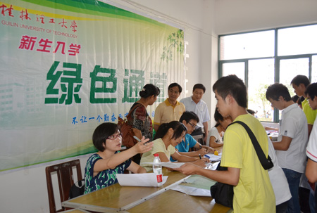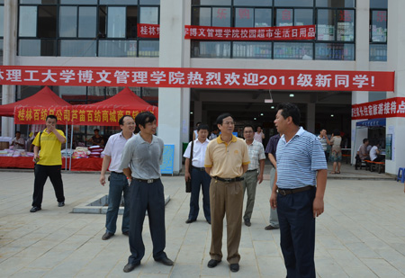 一年一度开学季, 9月14、15日是我校2011级新生报到的日子,在我校雁山校区三号教学楼广场和二号学生组团公寓新生接待点,彩旗飘扬,帐篷成列,欢迎条幅醒目,各职能部门和学院接待点的工作人员、迎新志愿者们早早到岗,热情洋溢地迎接新生入学。学校党委书记赵艳林,校长张学洪,党委副书记、纪委书记赵君,党委副书记王赣华、副校长陈学军在党(校)办、组织部、宣传部、学工处、团委、教务处、保卫处、基建处、后勤集团等部门相关负责人的陪同下视察了各迎新接待点、新生宿舍及刚刚投入使用的二号食堂,欢迎新生及家长的到来。