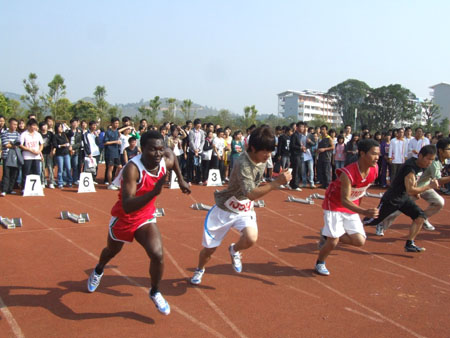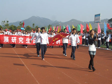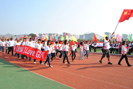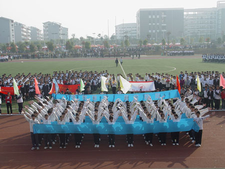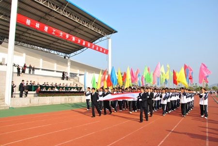 11月5日上午8:30分,伴随着初冬明媚的阳光,我校雁山校区运动场上锣鼓喧天、彩旗飘扬,到处洋溢着青春与梦想的气息,桂林理工大学第39届田径运动会在雁山校区运动场隆重开幕。学校党委书记赵艳林,校长张学洪,学校党委副书记、纪委书记赵君,副校长肖岳峰、陈学军、周国清以及学校各部门、各学院领导出席了开幕式。开幕式由赵君副书记主持。 在运动员入场仪式上,首先是象征大学生朝气蓬勃、锐意进取的第39届运动会会徽方队以铿锵的步伐走过主席台,接着是鲜花方队以及地球科学学院等16个学院各具特色的方块队依次迈着整齐坚定的步伐经过主席台,接受校领导的检阅。之后,进行了活力四射的团体健美操表演、跳绳和街头篮球秀。各个代表队服装统一,精神抖擞,口号响亮,步伐坚定有力,展示了我校良好的精神风貌。 在庄严的升国旗仪式之后,张学洪校长发表了热情洋溢的致辞,他指出:发展体育事业,增强人民体质,是践行以人为本的理念、促进人的全面发展的必然要求,而一年一度的运动会是全校的体育盛事,是我校广大师生展示风采、促进交流的舞台。希望广大师生积极参与“阳光体育”活动,用实际行动响应“每天锻炼一小时,健康工作五十年,幸福生活一辈子”这一时代口号;希望全体裁判员认真遵守裁判员准则,公正公平,优化赛场秩序;希望广大运动员在发扬拼搏精神、超越精神、合作精神的同时更要用团队的力量赢得比赛,跑得更快、跳得更高、投得更远。