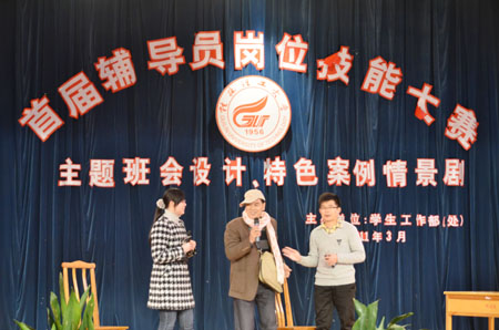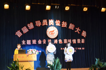 本次辅导员岗位技能大赛分为主题班会设计、特色案例情景剧、辨认学生比赛和日常管理基本知识竞赛四个主题。此次参赛的是“主题班会设计与特色案例情景剧” 两个部分,共有来自学工处、校团委和各学院近50名学工人员参赛。经过激烈的角逐后,主题班会《感恩》因设计新颖、贴近学生、可操作性强获得该主题的一等奖,并夺得“最佳创意奖”; 特色案例情景剧《梦想飞扬》因剧情贴近学生生活,内容丰富,立意深刻获得该主题的一等奖;特色案例情景剧《迷失》夺得最佳表现奖。 本次比赛较好地展现了我校辅导员们的精神面貌和学工人员的专业特点和职业特长。辅导员们真情演绎的情景剧也体现出了我校学生工作方法和思路上的开拓创新,对今后处理类似学生工作具有较好的参考和借鉴意义。