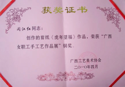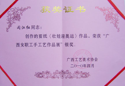 我校闵江红老师的剪纸作品荣获自治区“广西女职工手工艺作品展”银奖