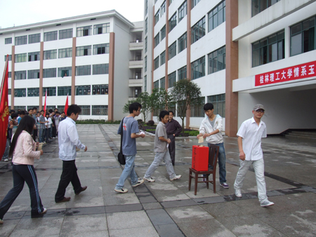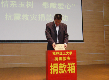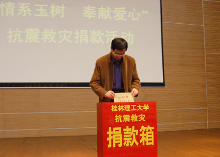 4月14日上午7点49分,青海省玉树藏族自治州玉树县发生7.1级地震,灾情造成当地巨大的人员伤亡和财产损失。灾情深深牵动着我校广大师生的心。为了表达对灾区人民的深切关爱,支援抗震救灾,帮助重建家园,4月21日下午,我校在屏风校区、雁山校区举行了“情系玉树、奉献爱心”抗震救灾捐款活动。 学校党委书记赵艳林,学校校长张学洪,党委副书记、纪委书记、工会主席赵君,党委副书记王赣华,副校长肖岳峰、阮百尧、陈学军、吴志强,党委委员、校长助理华桂林,党委委员陈贵英分别出席屏风校区和雁山校区的抗震救灾捐款活动并捐款。副校长肖明贵、周国清出差在外,专门委托他人代为捐款。 捐款前,学校领导、全校中层干部、教师和学生代表首先对青海玉树地震遇难同胞默哀。赵君副书记和陈学军副校长代表学校党委、行政分别在屏风校区和雁山校区捐款活动启动仪式上作动员讲话,号召学校各级领导干部、广大教职工和同学们向灾区人民伸出援手,为灾区同胞捐款和提供援助,支持地震灾区抗震救灾和灾后恢复重建,与灾区人民风雨同舟、守望相助、共度难关、重建家园。 在捐款活动现场,广大干部、教职工和同学们纷纷慷慨解囊,奉献爱心,以实际行动弘扬中华民族“一方有难、八方支援”的传统美德。截至下午6时,学校屏风校区和雁山校区已募捐到第一批善款69202.7元。目前,学校工会、学工处、团委、离退处组织的在职教职工、全校学生和离退休人员募捐活动仍在进行中。