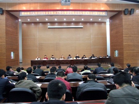 4月19日下午,我校在图书馆报告厅召开安全稳定工作会议并举行了安全稳定目标管理责任状签字仪式。学校党委书记赵艳林,党委副书记、纪委书记赵君,党委副书记王赣华,副校长肖岳峰、陈学军、吴志强,党委委员、校长助理华桂林,党委委员、组织部部长陈贵英等出席会议。学校副处以上领导干部以及各二级党委党委委员,直属单位、校办企业负责人参加了会议。 会上,肖岳峰副校长总结通报了2009年我校校园安全稳定工作所取得的成绩,指出了工作中存在的问题与不足,分析了影响2010年学校校园安全稳定的几个主要因素,并就2010年校园安全稳定工作进行了部署:一是要提高认识,明确职责;二是要狠抓落实,扎实工作;三是要排除隐患,确保稳定;四是要实行责任追究,奖罚分明。 随后举行了安全稳定目标管理责任状签字仪式。王赣华副书记,肖岳峰副校长代表学校现场与地球科学学院、信息科学与工程学院、党(校)办签订了《桂林理工大学2010年社会治安综合治理和安全稳定工作目标管理责任书》、《桂林理工大学2010年消防安全目标管理责任书》。其余各单位将在会后签订。 赵艳林书记在会上就做好我校2010年校园安全稳定工作提出以下几点要求,一是要牢固树立“安全稳定工作压倒一切”的意识,确保学校安全稳定;二是要努力构建、不断完善维护校园安全稳定工作的体制和机制。三是要全力为校园安全稳定工作提供人员和物质等方面的保障,为学校发展创造良好的环境。
