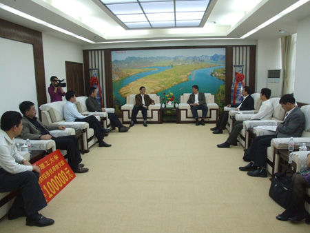 扶绥县委副书记、副县长罗彪(右一)介绍扶绥县经济建设发展情况