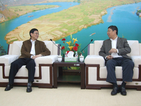 崇左市委书记、人大常委会主任赵乐秦(右)与我校党委书记赵艳林(左)亲切交谈
