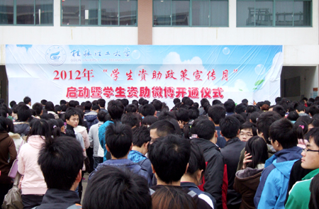 学校2012年学生资助政策宣传月活动启动仪式暨学生资助微博开通仪式于3月23日下午在雁山校区举行。学校党委王赣华副书记和各学院党委副书记、辅导员及受助学生代表一同参加活动启动仪式。 王赣华副书记代表学校党委向全体受助学生表示亲切问候,并要求要充分认识做好学生资助工作的重大意义,负责学生资助工作的部门和老师要增强责任感和使命感,确保将国家惠民政策落到实处;希望广大同学深刻理解国家实施学生资助政策的意义,进一步增强对党、对国家的热爱之情,常怀感恩之心,常思报国之志,珍惜大学时光,刻苦学习、立志成才。 学工部(处)长熊英在仪式上介绍了2012年学生资助政策宣传月的主要活动。整个活动持续一个月,共分校级层面活动和学院层面活动。在校级层面活动将举行“心怀感恩 诚信求学”知识抢答赛、“励志、诚信、感恩”征文比赛、开设“勤助大讲堂”和进行学生资助政策展板宣传等。同时各学院结合学院实际也将开展一系列创新性活动。学生代表、学校“自强之星”——化学与生物工程学院生物工程09-2班夏迎春同学作为学生代表发言,她表示将树立诚信感恩意识,自强自立,勤奋学习,并积极向身边的人做好学生政策宣传,让更多人了解学生资助政策。 最后,王赣华副书记和熊英部(处)长为“桂林理工学生资助”微博开通仪式剪彩。微博的开通旨在提供学生资助政策宣传和对学生解疑答问的信息化新平台,提高学生资助工作的时效性。