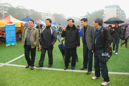 自治区就业指导中心主任蒋瀚洲(左一)等领导亲临双选会现场指导工作