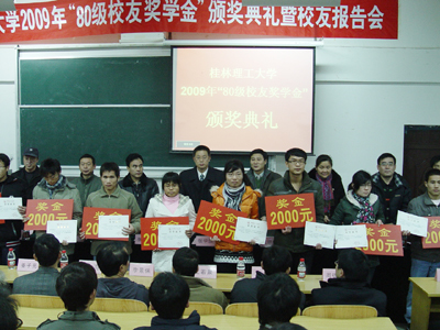 12月20日,我校2009年“80级校友奖学金”颁奖典礼在雁山校区举行。校长张学洪,党委副书记王赣华,80级校友代表张志强、蒙隆华、冯佐海、李景保、周力青、王殿华、王若晨、赖有超,校友工作办公室主任、校长办公室副主任程安福及相关单位负责人和老师出席了颁奖典礼。颁奖典礼由学工部(处)长熊英主持。 会上,王赣华副书记宣读了《关于公布2009年“80级校友奖学金”获奖学生名单的通知》,赵俐等26名同学获得学校2009年度“80级校友奖学金”,在主席台就座的领导和80级校友代表为获奖同学颁发了证书与奖金。随后,学校80级校友代表王殿华老师、获奖学生代表赵俐同学在颁奖典礼上作了发言。 张学洪校长代表学校对80级校友表示感谢,并对获奖同学表示祝贺。他强调,“80级校友奖学金”的设立旨在激励大家勤于钻研、勇于实践、开拓创新、精益求精。它不仅是一种物质帮助,更是一种精神鼓励。他希望大家以80级校友为榜样,胸怀抱国之志,常怀感恩之心,好好把握大学时光,努力奋斗,用实际行动谱写动人的青春篇章。 我校“80级校友奖学金”于2007年11月由原桂林冶金地质学院地质系80级校友张志强倡议发起,原地质系、物探系和化探系的80级校友们共同出资设立,用以帮助品学兼优、家庭经济困难的同学完成学业。三年以来,学校共有82名学生获此殊荣,其中2007年25名,2008年31名,2009年26名,发放奖学金总金额达18.9万元。 颁奖典礼结束后,80级校友天津校友会会长张志强给同学们作了以《自强、自信、自立》为题的专题报告。