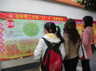 日前,中共桂林市委员会宣传部、桂林市司法局、桂林市依法治市办公室联合颁发文件《关于开展2009年“12·4”全国法制宣传日暨法制宣传大篷车——走进桂林活动的通知》,并与12月4日统一组织了全市的法制宣传活动。三里店大圆盘是本次活动地点之一,当日上午,我校党委宣传部、社区管理办公室共同制作的法制宣传板报,参加了在三里店大圆盘举办的2009年“12·4”全国法制宣传日活动的法制宣传板报展览。宣传板报重点宣传了我校如何加强法制建设促进和谐校园的构建、大学生怎样加强法制意识以及社区居民应该具备的法律基本知识,内容丰富且紧扣今年全国法制宣传日活动主题,板面设计美观大方,在参赛的100多块板报中荣获三等奖。