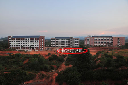 雁山校区标志性建筑图书馆工程日前动工。该工程总投资7500万元,主体建筑建安费4387万元,其中利用国家开发银行贷款5000万元。合同工期490天。工程总建筑面积32600平方米。主体七层,局部二、六层,建筑总高度31.5米。采用中庭式建筑布局,一层为图书馆基本书库、借还大厅及学术报告厅,二层为大空间展厅,三至七层主要为藏阅空间,地下室为停车库和设备用房。