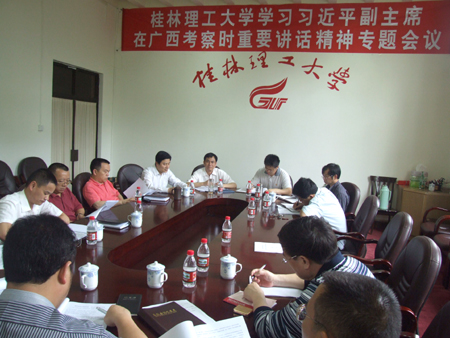 5月19日下午,学校党委中心组在校办第二会议室召开专题会议,学习贯彻习近平副主席在广西民族大学考察时重要讲话精神。学习会由赵艳林书记主持,中心组全体成员参加了学习。 与会人员一起认真学习了自治区高校工委、教育厅下发的文件《关于组织学习习近平副主席在广西民族大学考察时重要讲话精神的通知》和习近平副主席在广西民族大学考察时重要讲话内容。赵艳林书记、张学洪校长、王赣华副书记先后在会上作了主题发言。 赵艳林书记在主题发言中指出,习近平副主席的讲话充分体现了党和国家对广西高等教育的高度重视,充分体现了党中央和习近平副主席对广西广大教育工作者和青年学生的亲切关怀和殷切希望。学习贯彻好习近平副主席重要讲话精神,必须深刻领会,把思想和行动统一到讲话精神上来。进一步创新工作方式,切实加强党的建设、师德师风建设和大学生思想政治教育工作。我们要以学习习近平副主席讲话精神为动力,以建设特色鲜明的高水平理工大学为目标,加快学校教育教学改革步伐,推动学校科学发展新的跨越,办人民满意的高等教育。赵艳林书记还就如何结合我校实际,认真贯彻落实好习近平副主席重要讲话精神,提出七点要求:一是抓好学校发展规划的制定工作。要根据党代会提出的总体目标要求,认真谋划好下一步各项工作。二是加大人才引进和培养的力度,最大限度地提高人才队伍建设水平。三是以重点学科、重点实验室平台建设为龙头,以点带面,更好地推进学校学科与专业建设。四是适应时代发展要求,认真思考总结,进一步加大教育教学改革力度。五是关心、关爱学生,一切为了学生的成长着想,努力为学生的成长创造良好的条件,让家长放心、社会满意。六是确保学校的安全稳定。学校的安全稳定是做好学校一切工作的基本前提,安全稳定工作一定要常抓不懈。七是大力宣传,营造浓厚的学习氛围,在全校师生中掀起学习习近平副主席讲话精神的高潮。最后,赵艳林书记希望全校干部职工要将习近平副主席的重要讲话精神落实到日常的工作中去,为提高我校的教育教学质量,为广西高等教育的发展做出自己的贡献。 张学洪校长在主题发言中就贯彻落实习近平副主席重要讲话精神,做好我校当前主要工作进行了安排部署。一要狠抓教学质量,进一步做好专业建设及学科调整工作,切实抓好教风、学风建设,以教风的转变促进学风的转变。二要加强师资队伍建设,通过学习讲话精神,培养造就一支业务过硬、作风优良,切实能够做到立德树人的教师队伍。三要深刻领会习近平副主席讲话精神实质,以学习讲话精神为契机,认真做好学校的人才引进、“十二五”发展规划的启动、硕士点规划等各项工作。 王赣华副书记在发言中重点就学习贯彻习近平副主席重要讲话精神如何做好学生工作,提出四点意见。首先是按照习近平副主席对学生思想政治素质提出的明确要求,加强大学生思想政治工作,把社会主义核心价值观教育融入到学生教育的全过程,引导学生树立正确的世界观、人生观和价值观。其次要高度重视学风建设,进一步抓紧做好学风建设各项工作;第三是继续做好学生党员教育管理工作,特别是解决好大学生党员对“入党为什么”问题的认识,通过抓好学生党员素质与能力的全面提高来带动全体学生,促进学生成才。第四必须做好当前的学生就业工作和入伍预征工作,积极为大学生锻炼成才、报效国家创造条件,做好各项服务工作。