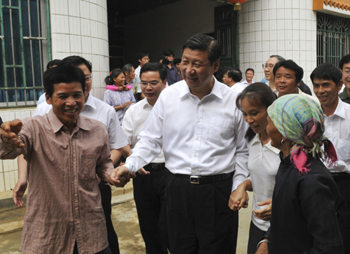 2009年8月以来,广西出现了严重的秋冬春连旱,旱情最严重时,全区109个县(市、区)中,有105个县(市、区)发生不同程度的气象干旱。全区受灾人口1237万多人,有近60万人需要送水才能解决生活饮水。农作物受旱面积1951万多亩,绝收127万多亩。习近平十分牵挂广西的旱情,曾多次向自治区主要领导打电话询问抗旱救灾情况,就做好抗旱救灾工作作出了许多重要指示。这次考察中,他详细了解广西抗旱救灾采取的措施,取得的成效。 得知旱情发生后,自治区各级党委、政府坚决贯彻落实中央领导的重要指示精神,全力以赴做好抗旱保生活、保生产、保增收各项工作,目前已取得阶段性成果,随着雨季的来临,旱情正在进一步缓解,习近平十分满意。他说,广西发生这么大的旱灾,能够做到没有一人缺水喝,没有一起抢水纠纷,没有一家断粮,各级党委和政府工作是富有成效的。他充分肯定了广西大兴水利,集中力量做好大石山区30个县人畜饮水工程建设大会战、规划建设重点水源工程的做法和经验。习近平指出,要立足当前、着眼长远,统筹谋划、综合施策,加强农田水利等基础设施建设,努力从根本上解决群众饮水难问题,全面提高防灾抗灾减灾能力。现在,部分地区已全面进入汛期,要积极做好防汛抢险各项准备工作,认真开展防汛安全检查,确保安全度汛,确保人民群众生命财产安全。 10日上午,习近平踏着一路泥泞,来到田阳县那满镇内江村,考察灾区春耕生产情况。夏初的右江河谷,田畴间铁牛欢歌,农民正在紧张地耕田插秧,好一幅繁忙的春耕生产场景。 习近平与正在劳作的农民黄广华亲切地攀谈起来:家里有几亩地?种的是什么作物?农产品销售情况怎么样?水利设施建设得如何?一年家里收入有多少?支农惠农政策落实到位了没有?……黄广华一一作了回答。 得知这个村农民收入不断提高,家家盖起新的楼房,人人安居乐业,生产致富有奔头,习近平十分高兴。他说,现在是农业农村发展的大好时期,党和政府的支农惠农政策越来越好。政策好,关键要落实好,要切实落实到每个农民身上。 在田埂边,习近平向黄广华学习了抛秧技术,并和他一起抛起秧来,引起大家阵阵会意的欢笑。 田阳县那满镇新立村共联屯位于右江南岸,是1977年从新立村石山片各自然屯搬迁出来落户形成的移民屯,居住着82户壮族农民,全村256亩耕地全都是旱地。10日上午,习近平来到这个小村屯,立即受到村民的热烈欢迎。习近平走村串户,与村民拉家常,亲切握手,问长问短。 习近平走进村民马正规家里,到沼气灶前看看沼气使用情况,揭开米缸看看有多少存粮,到水池边看看存水用水状况。闻讯赶来的村民涌了进来,习近平与大家围坐下来,向大家详细询问生产生活情况。 马正规告诉习近平:全家4口人,自己经常闹胃痛,只能在家种地;妻子农闲时外出打工补贴家用;母亲75岁了,只能做些家务;18岁的孩子在广西银行学校读书,一年要花6000多元。所以家里负担比较重。现在农民有了养老保险,耕地种粮有补贴,党的政策确实好。 “但是,农民要进一步发展生产,资金上确实也有困难。我想进一步扩大养猪规模,多种些芒果,就是难贷到款。”马正规请习近平帮助解决目前生产上遇到的难题。 “除了贷款难,大家还有什么其他困难?”习近平真诚地问村民。 村民们坦率地提出:旱地缺乏灌溉设施,还有11个屯没有通公路,大石山区饮水困难,屯里没有村民活动中心,沼气池建设补助标准偏低…… 习近平说,大家的需求很现实。解决大家提出的困难,一方面要靠乡亲们自力更生;另一方面要靠政府提供更多更好的公共服务。对贫困地区和共联屯这样的移民村屯,各级党委、政府要根据特殊困难和实际需要,采取有针对性的政策措施,保护好广大群众的生产积极性,帮助他们发展生产,提高生活水平;要加强政策引导和产业扶持,把产业扶贫开发和城乡统筹扶贫开发结合起来,特别要抓好边境地区、革命老区、大石山区、民族自治县的扶贫开发工作。 郭声琨回答:我们一定落实好习近平同志的重要指示精神,帮助大家解决困难,让群众满意。 习近平殷切地希望大家早日把新立村建设成为一个全面小康的社会主义新农村,真诚地祝福乡亲们的生活越过越好! 乡亲们唱起了动听的山歌,热情相拥着把习近平送到村头。